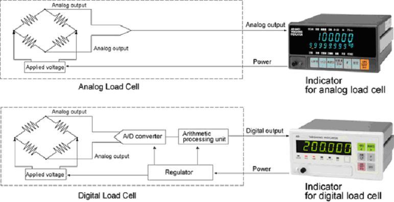 Tín hiệu từ loadcell số (digital loadcell) truyền về bộ chỉ thị là dạng số, trong khi tín hiệu từ loadcell tương tự (analog loadcell) truyền về bộ chỉ thị là dạng điện áp.
